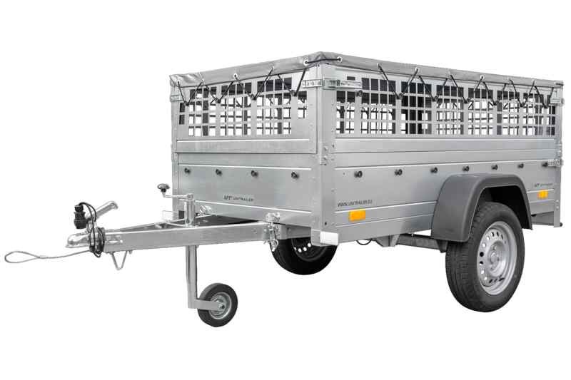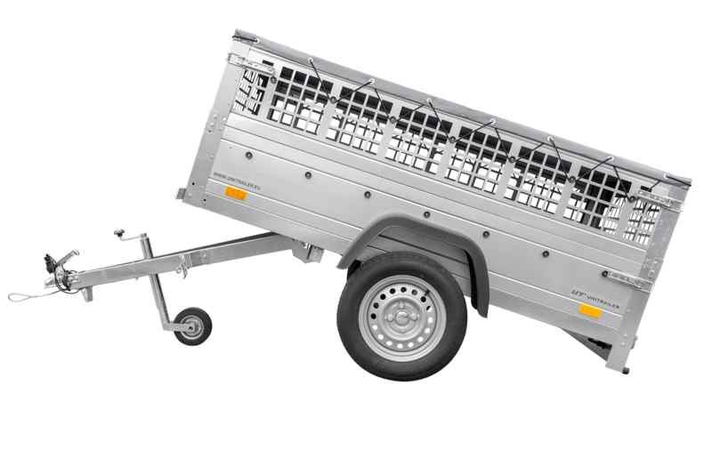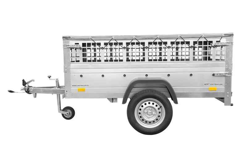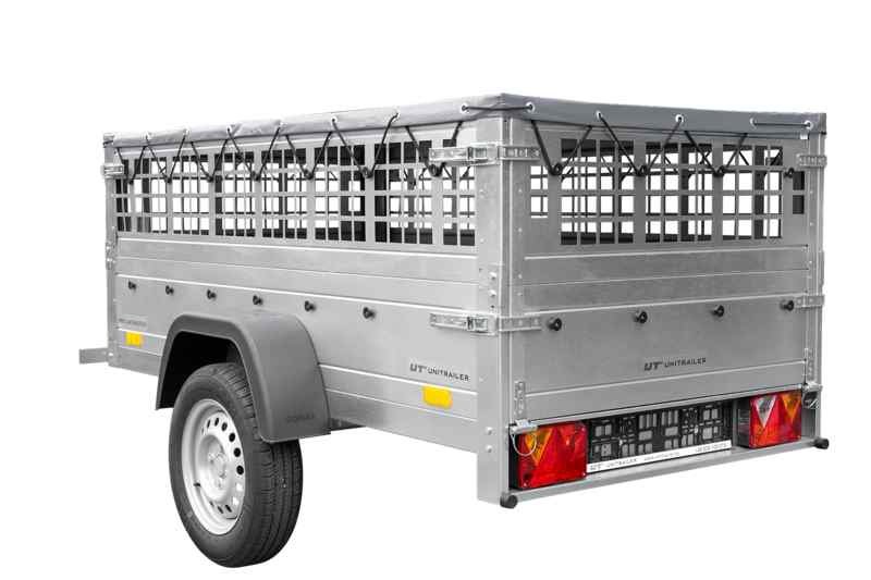 Soyez le premier à commenter “Remorque grillagée 200×106 UNITRAILER avec bâche plate grise, tiges de support bâche, ridelles grillagées et roue jockey – Garden Trailer 200 KIPP”