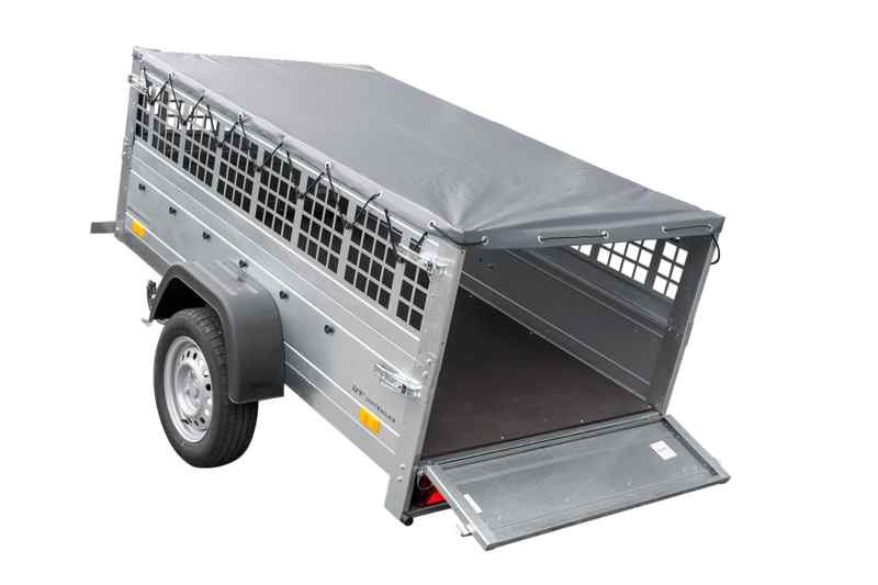 Remorque grillagée 200×106 UNITRAILER avec bâche plate grise, tiges de support bâche, ridelles grillagées et roue jockey – Garden Trailer 200 KIPP