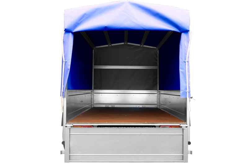 Remorque 750 kg (PTAC maximum) Garden Trailer 201 KIPP, version avec une bâche haute de 80 cm permet de transporter jusqu’à 626 kg de la cargaison (avec le PTAC de 750 kg) sur le plancher de 200×125 cm et avec les ridelles de 30 cm.