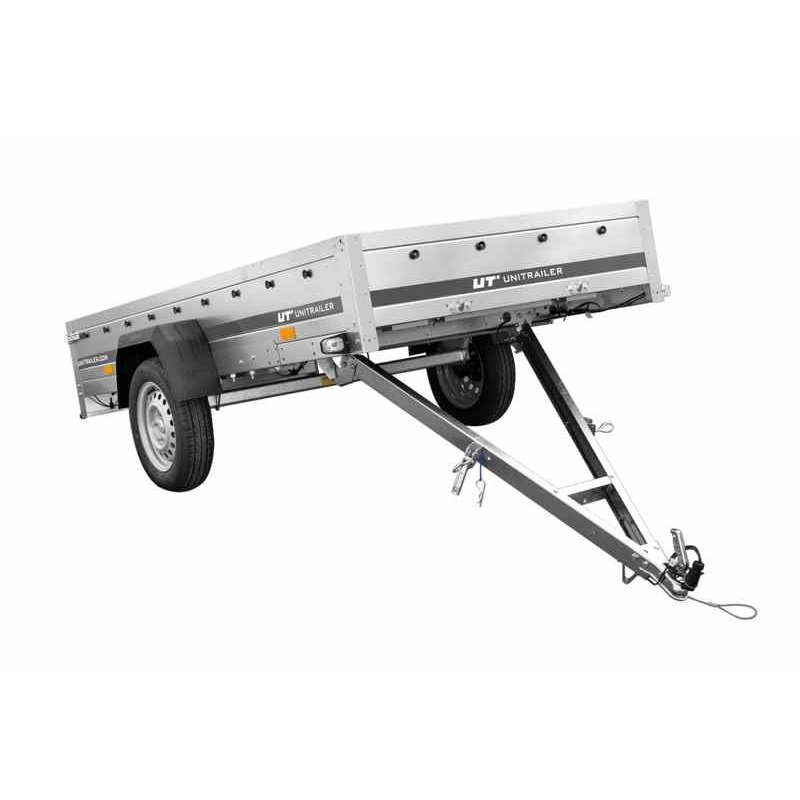 • CHÂSSIS – 1 essieu du fabricant Knott ou ALKO – fabriqué sur commande pour Unitrailer. Taille de roue : 155/70 R13. Timon en V. Suspension : indépendante, ressortant sur un arbre de torsion. Roues à l’extérieur de la zone de chargement.