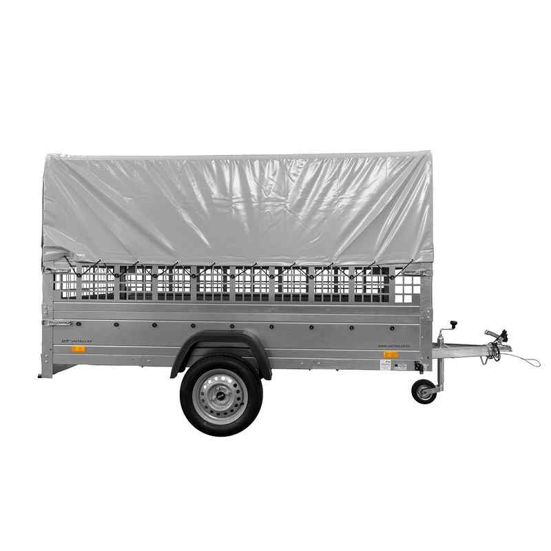 Une Remorque un essieu avec un timon inclinable dans un ensemble avec une roue de support, des côtés grillagés et un châssis H-800 avec une bâche grise. Remorque avec possibilité de replier le timon et de basculer. Vous commandez en ligne avec livraison gratuite.